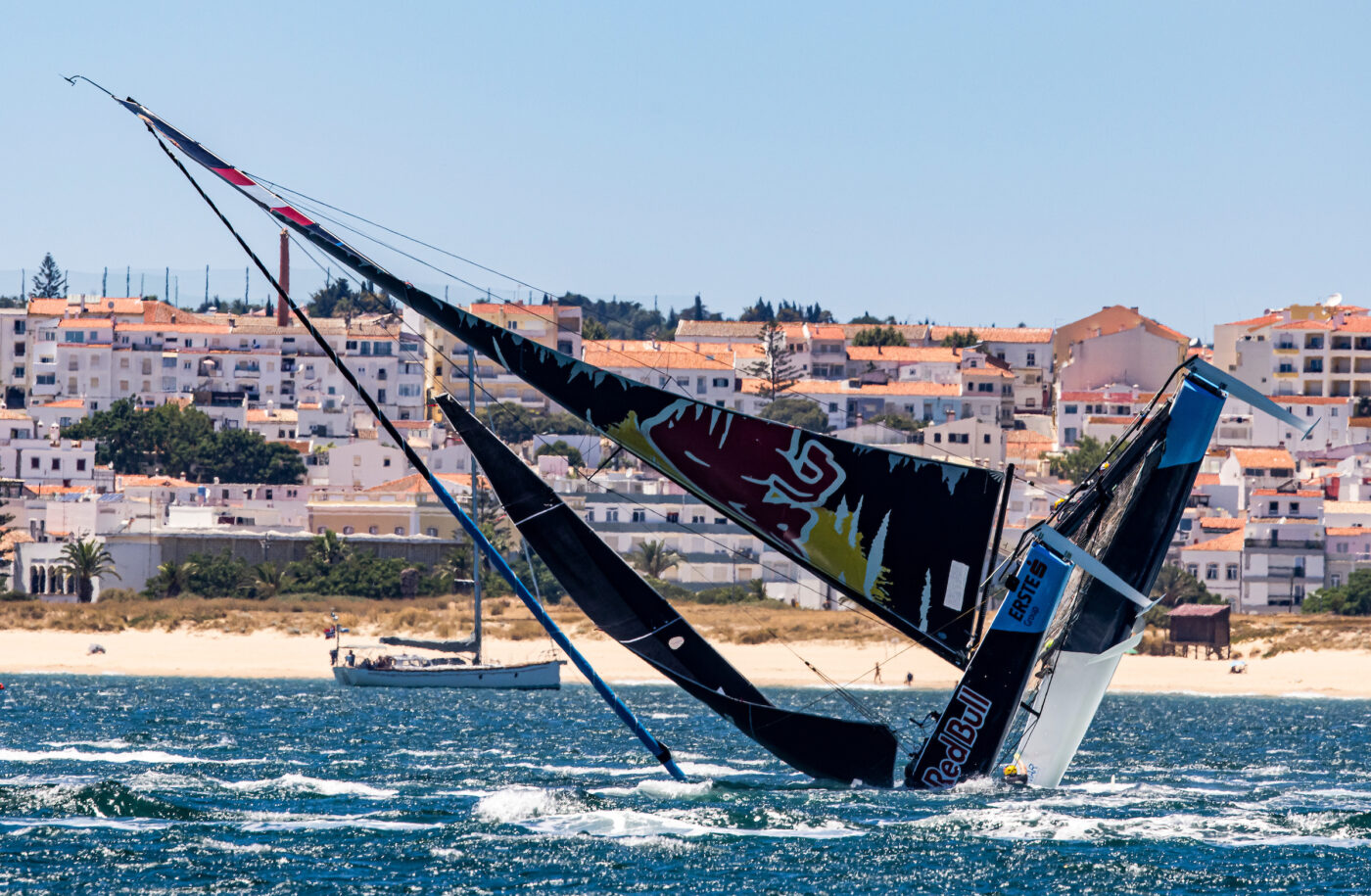 After over 18 months away from the start box, the elite sailing teams of the GC32 Racing Tour were back in action on 30 June-4 July, the first of two consecutive stops in Lagos, Portugal. Led by sailing legends Roman Hagara and Hans Peter Steinacher – both in their final competitive season – Austria’s Red Bull Sailing came back from a pitchpole capsize to finish second among rivals including two-time America’s Cup winner and defending tour champion Alinghi (SUI) and longtime adversary Zoulou (FRA). Regatta podium: Alinghi in first, Red Bull Sailing in second and formidable Danish SailGP newcomers Rockwool Racing in third. Here’s everything you need to know.