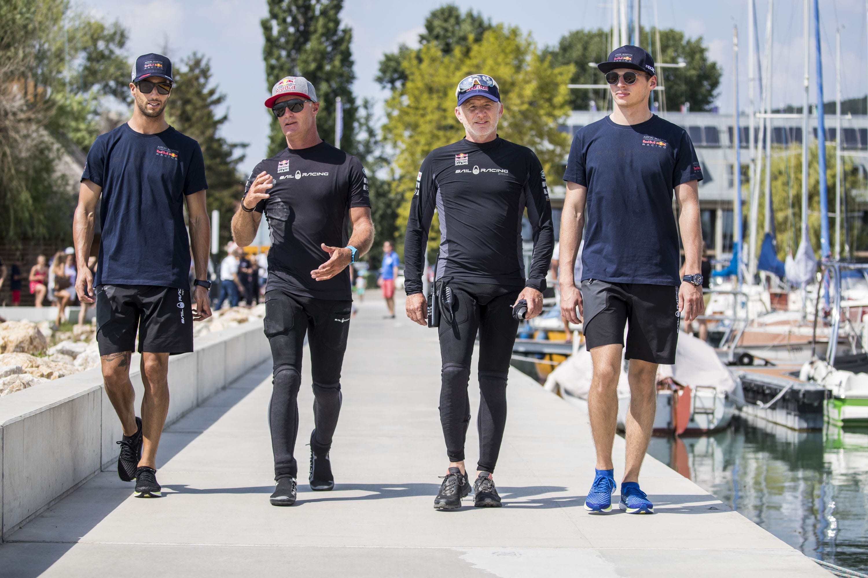 LAKE BALATON (HUNGARY) – Hagara and Steinacher, who are preparing for the Erste Kékszalag Grand Prix on the lake, welcomed Ricciardo and Verstappen onto Red Bull Sailing’s 40-foot catamaran as well as the GC32 foiling multihull that the team races in the Extreme Sailing Series. After the most successful Austrian summer sport athletes and other members of the Red Bull Sailing team gave the drivers an introduction to what high-tech sailing is all about, it wasn’t long before the F1 drivers decided to pair off with the Austrians for some match racing across the famous lake, with Hagara and Ricciardo manning the GC32. Meanwhile, Steinacher and Verstappen boarded the X40, and were almost immediately driven into a nose dive from the winds, a dramatic – and tough – start.