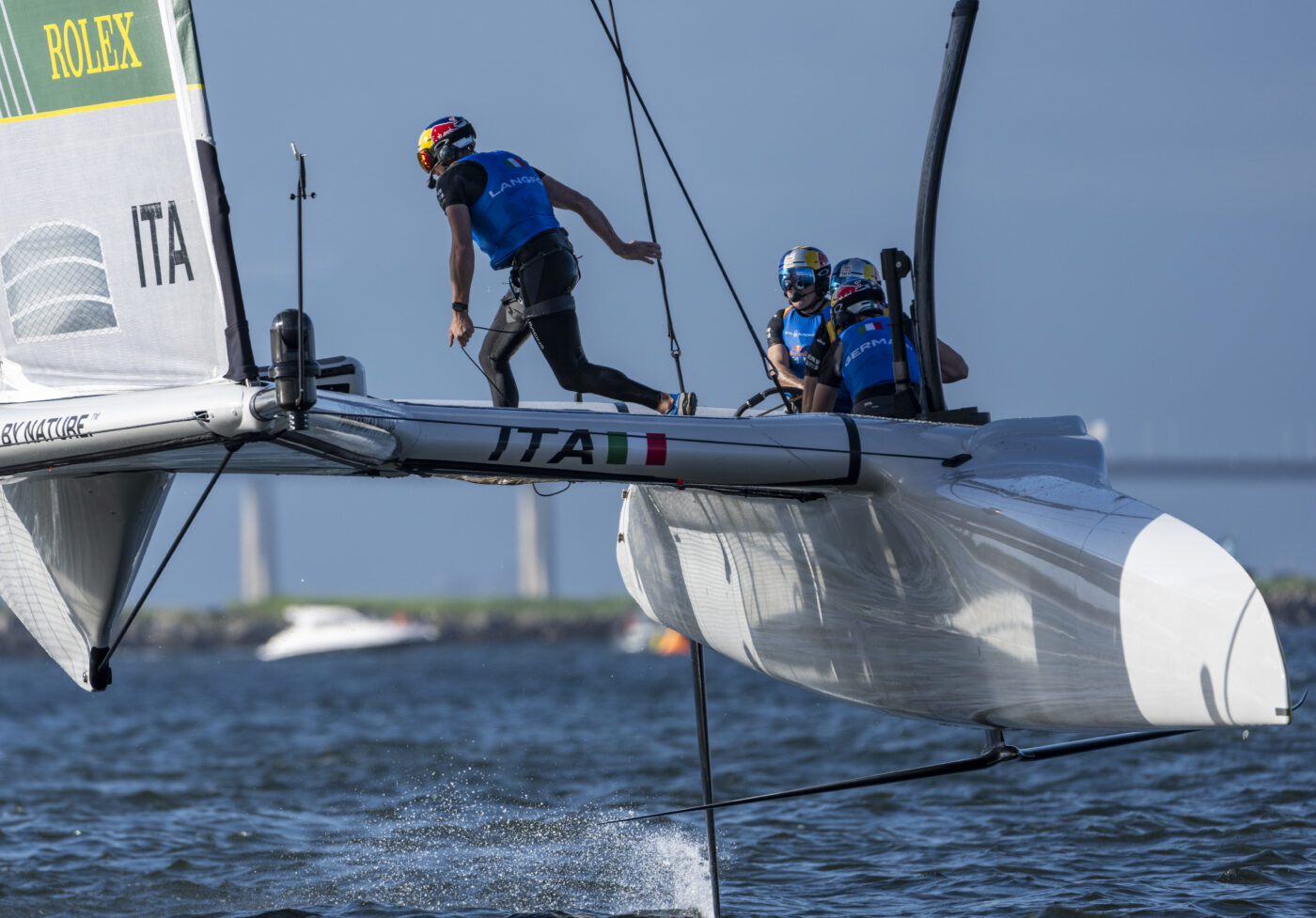 Sunday brought overcast skies and lighter winds, with the fleet switching to the 27.5-metre wing configuration and high-speed rudders – a highly technical setup with five crew members on board. The Italian team opened Championship Sunday with a strong second-place finish in Race 5, executed cleanly from start to finish with key overtakes on Sweden and Australia. Two tougher results followed in the remaining races, leaving the team seventh overall for the event.