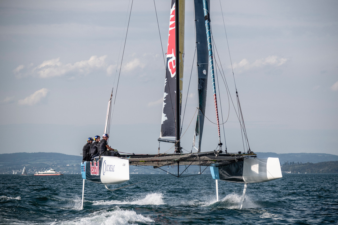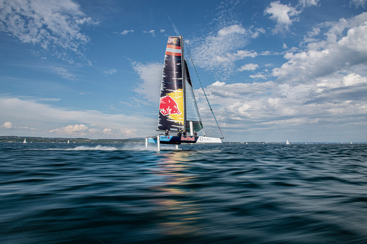 The Austrian double Olympic champions Roman Hagara and Hans Peter Steinacher are currently completing a training camp at the border triangle known as the Three-Country Corner. Between Konstanz (GER), Romanshorn (SUI) and Bregenz (AUT), the five-person Red Bull Sailing Team is testing new foils on Lake Constance, maneuvering a racing boat that’s capable of achieving 40 knots.