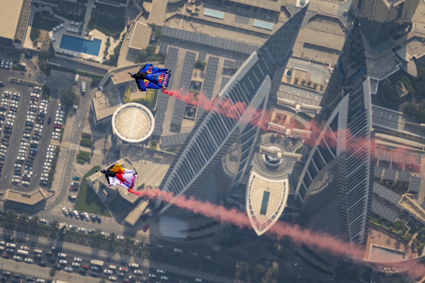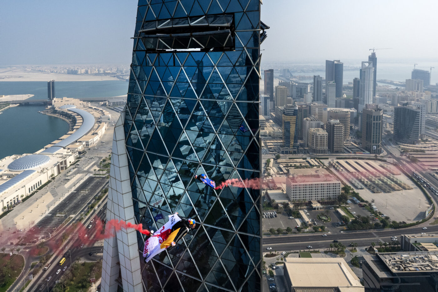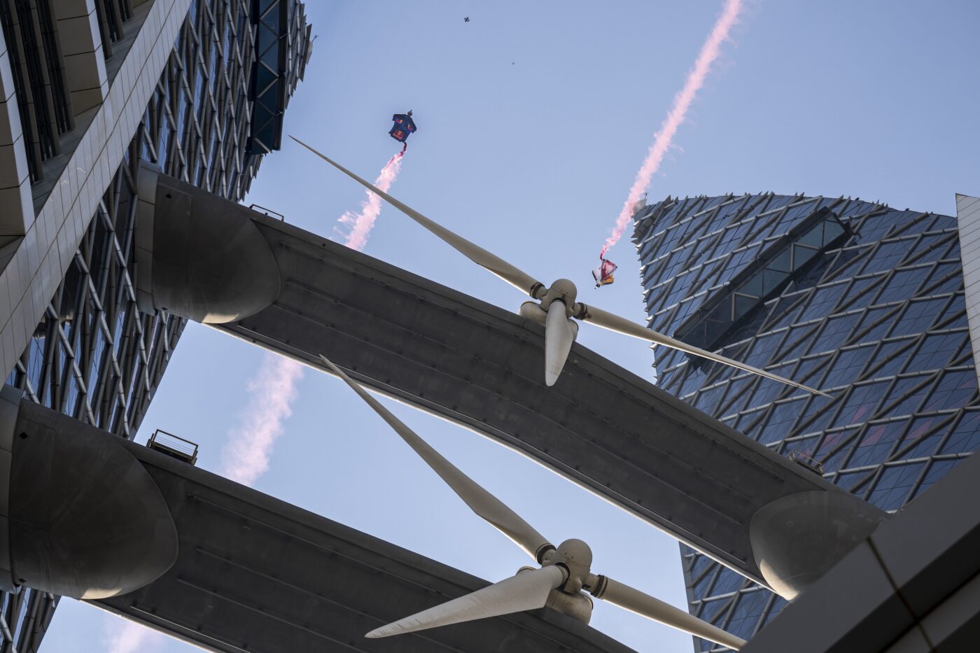 Exiting a Black Hawk helicopter at 4,000 ft (1,200 meters), the pair accelerated over Manama’s skyline, split into opposing lines, then turned back in for a choreographed approach into the centerline of the iconic towers 40 meters above the building’s trademark wind turbines.