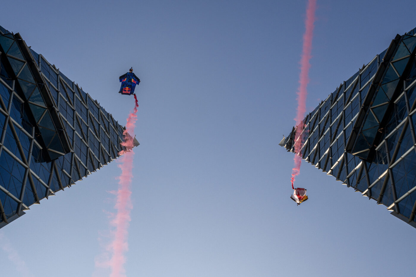Manama, BAHRAIN, December 09, 2025 – Wingsuit athletes Dani Román and Fred Fugen have pulled off a landmark world-first at the Bahrain World Trade Center, performing a synchronized, head-on crossing between the twin towers from opposite sides. Dropping in at 220 km/h each, they closed in at a combined 440 km/h – more than 120 meters every second – and passed the crossing point at the exact same moment, just 10 meters apart.