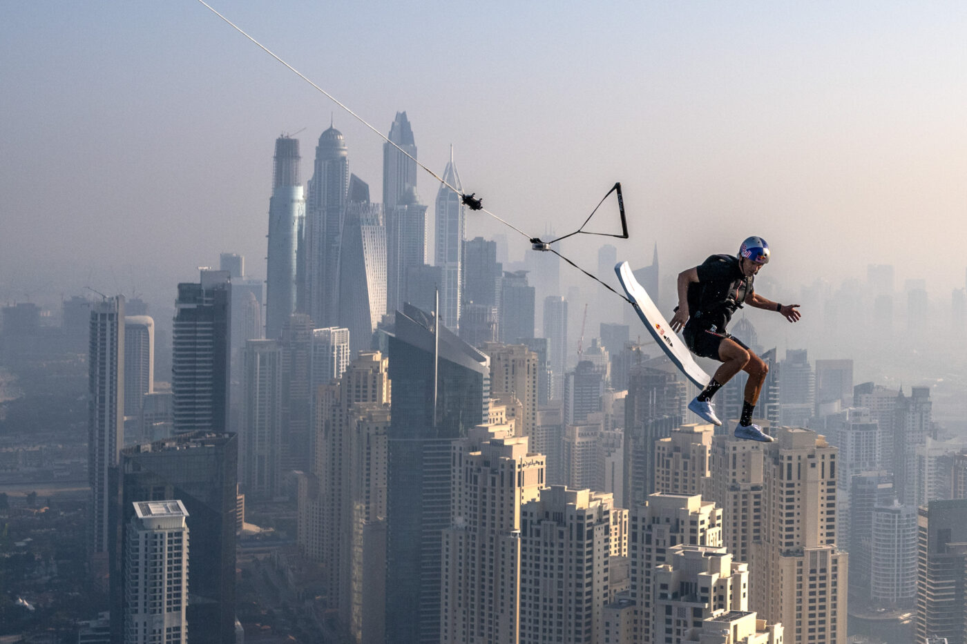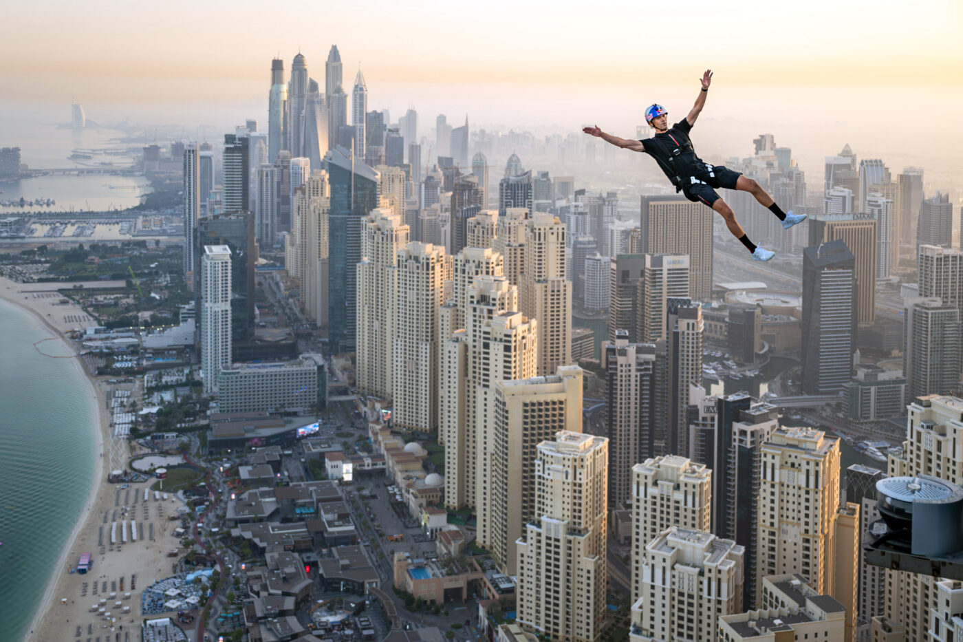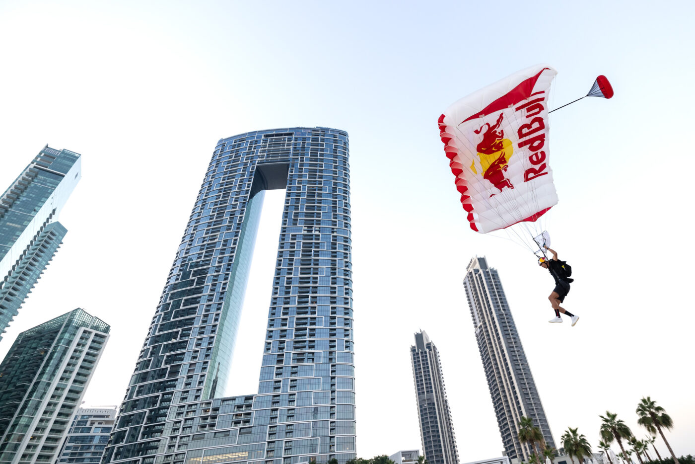Dubai, United Arab Emirates – December 4, 2023: American Wakeskating pioneer and three-time world champion Brian Grubb achieved an extraordinary world first in an innovative project that combined drone Wakeskating and BASE jumping. Perched atop the sky bridge at Dubai’s Address Beach Resort, the Guinness World Record-holding infinity pool sits an astounding 294 meters above sea level.
